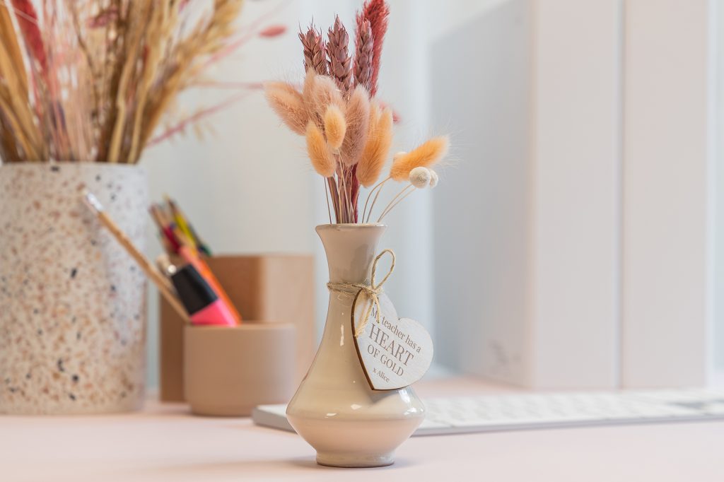Bloemen zijn altijd een top cadeau. Dit droogbloemboeketje is een leuke attentie waar de juf of meester heel de zomervakantie kan van genieten. Op het houten label kan je zelf een leuke quote toevoegen. Wat zal jouw juf of meester blij zijn!