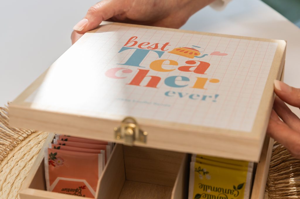 Verras je juf of meester met deze hippe theedoos. Het ideale cadeau! Die kan hij/zij dan vullen met hun favoriete thee. Zo kunnen ze elke dag genieten van een heerlijk theetje uit een gepersonaliseerde doos. Personaliseer met zijn/haar naam, een leuke foto of quote.