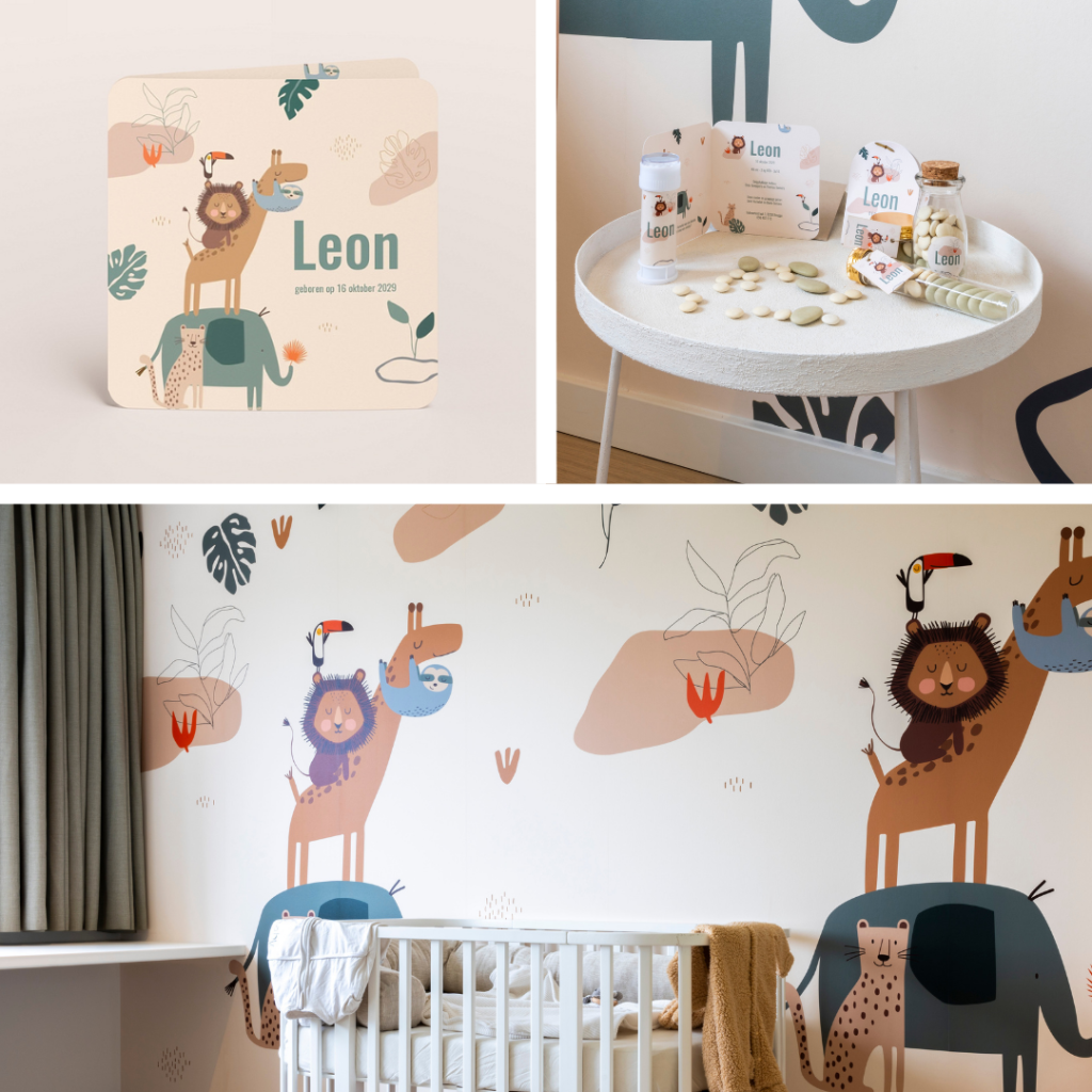 Ga all the way met jungle behangpapier dat bij je geboortekaartje past. Dankzij een unieke samenwerking tussen Tadaaz en Roomblush kan je het thema van je geboortekaart eenvoudig doortrekken in de inrichting van je kinderkamer, megaleuk!