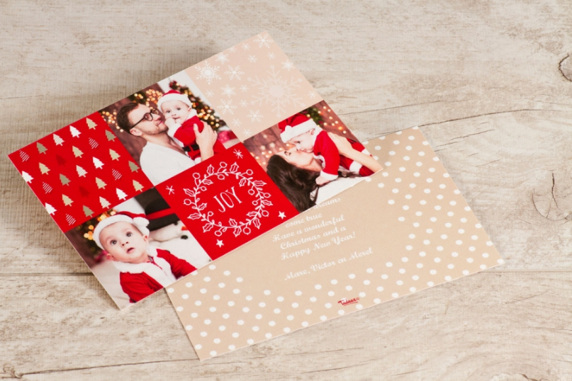 Een kerstkaart zoals veel mensen die kennen, met alle traditionele elementen die een kerstkaart moet hebben. In de kleur rood, mooie kerstfoto’s, kerstbomen en een moderne twist: de lichtroze kleur. Deze kersttrend straalt de gezelligheid van vroeger uit!
