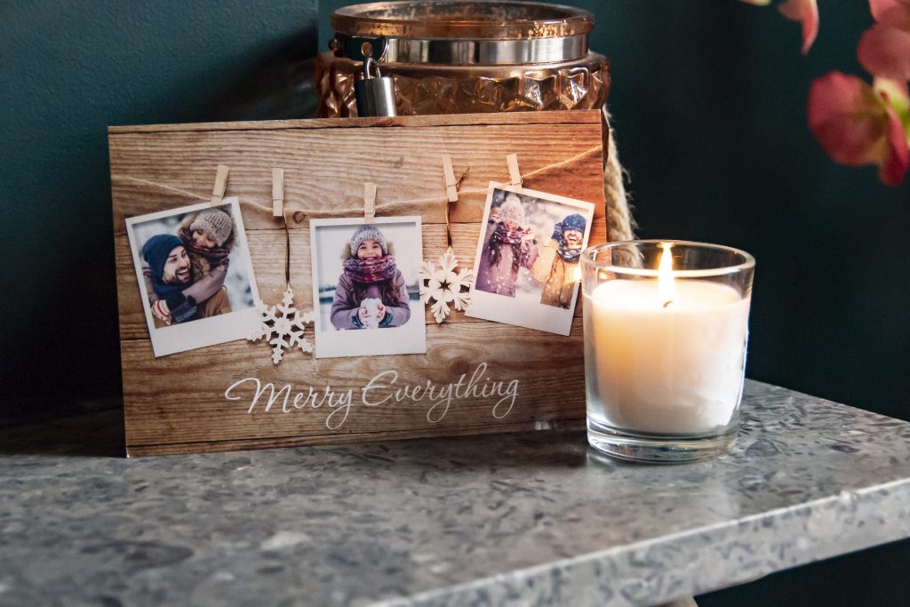 In deze originele vintage kerstkaart komen veel elementen van de vintage stijl terug. De houten achtergrond, witte letters en een mooie fotostrip. Plaats je drie mooiste herinneringen van het afgelopen jaar op de fotostrip en deel ze met jouw dierbaren. En waarom niet kiezen voor een vintage setting of filter voor je foto’s om het plaatje helemaal te laten kloppen?